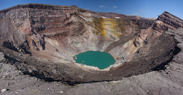 Камчатка. Кратер вулкана Горелый в котором до 2010 года находилось кислотное озеро, но из-за начавшегося извержение оно испарилось