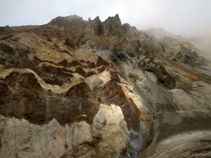 Планета земля исчезла совсем. Я и еще пара человек слегка отстали, делая фотки, от группы, которая уже исчезла в молочной дымке. С обеих сторон нависали скалы теряющиеся совсем не высоко в облаке над головой, а ветер не ощутимый внизу то приоткрывал, то снова прятал от нас невероятный калейдоскоп красок. Одна скала могла быть бирюзовой, резко или плавно переходя к бежевому, желтому, кофейному, красному, бурому, розовому, серому и тд. Такого я еще не видел ни в одних горах. А мы все перли вверх и вперед вдоль бурлящей снизу слева речки укрытой панцирем снежника, настолько присыпанного песком и пеплом, что выглядящим как камень.