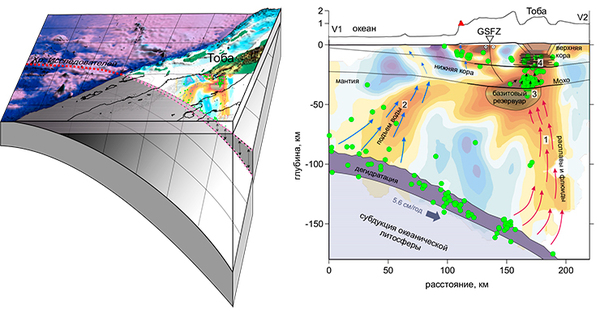 Томографическая модель в вертикальном сечении и ее интерпретация. На фоне показаны аномалии скоростей поперечных волн; красные области - пониженные скорости (много воды и/или высокая температура), синие - повышенные скорости (прочные холодные породы). Зеленые точки - землетрясения. Стрелки показывают пути миграции воды и расплавов. Сверху показан рельеф вдоль сечения. GSFZ - пересечение с Великим Суматранским разломом (слева). Схема, показывающая роль хребта исследователей в инициации супервулканизма Тобы. Красный пунктир - разломная зона вдоль хребта Исследователей, по которой на глубине происходит разрыв плиты, облегчающий выход воды из литосферы. Под кальдерой Тоба показано томографическое сечение (справа)