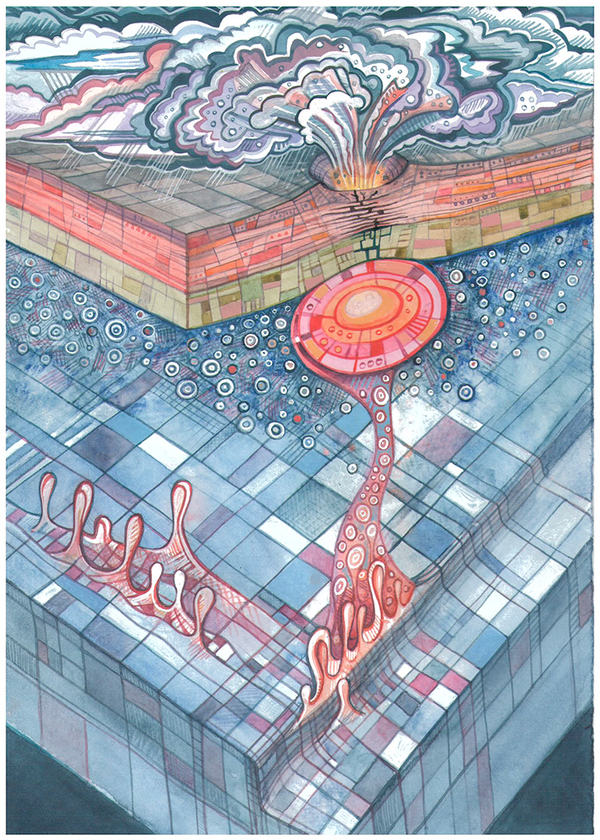 Основной причиной суперизвержений является накопление в недрах Земли воды, которая, как это ни парадоксально, является наиболее взрывоопасным веществом на Земле. Рисунок И. Кулакова, бумага, акварель