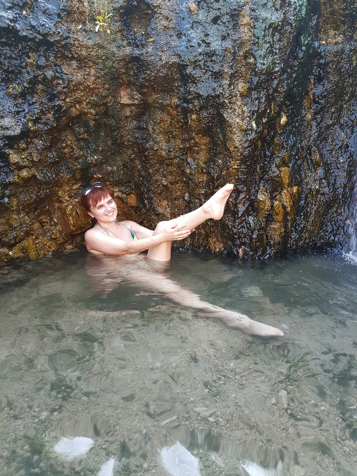 Пришло время уезжать. По пути, как и собирались, остановились у Верхне - Паратунских источников. Но до них еще нужно дойти, подъем в гору. Это был наш первый подъем. Склон сопки, на котором находятся источники, весь порос огромными кустами ядовитого борщевика, на Камчатке его называют Пучка. Поднимались по оборудованной лестнице примерно 15 минут, стараясь не соприкасаться с ядовитыми кустами. Небольшие естественные бассейны с горячей минеральной водой, расположенные каскадом. Горячая вода бьет прямо из сопки, переливается по этим каскадным ваннам и уходит вниз. Какое же было блаженство расслабится и наслаждать целебной горячей ванной и одновременно любоваться видами. После такого купания, мы почувствовали себя посвежевшими, отдохнувшими, словно заново родились.