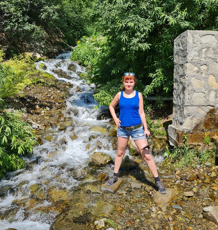 У нас все готово. Движемся вверх к Вилючинскому перевалу. Вторая остановка была возле водопада "Зайкин ключ". Небольшой ручей искрился на солнце и казалось, даже звенел кристальной чистотой. Здесь я впервые поняла, что воду из местных рек можно и даже нужно пить. Ведь она полезная и наполнена разными природными микроэлементами. Наверное, это и называется "Живая вода", помните из русских сказок. А еще, она очень вкусная. Не знаю, можно ли так сказать о воде, но она действительно вкусная. Сделали фото, наполнили емкости водой и поехали дальше.