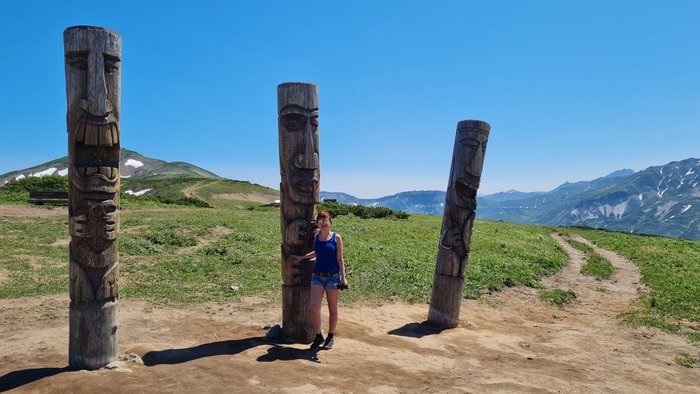 Третья остановка на Вилючинском перевале. По плану не должны были долго задерживаться, буквально 20- 30 минут и дальше. Но тут вмешались местные боги, которым было виднее, когда и куда нам нужно ехать, и в какой момент мы будем готовы к тому, что нам предстоит. Они, этельменские идолы, между прочим, стоят прямо там, втроем, высотой более 3 метров (зимой их полностью заметает снегом). Один с рыбой, другой с трубкой, третий с бубном. По возвращению к машине, нас ждал крайне неприятный сюрприз. Обнаружилось, что в автомобиле потек радиатор. И подручными средствами поломку никак не починить. Ехать так дальше нельзя, решено было остаться на перевале и любоваться его красотами и потом спускаться обратно, заночевать на базе отдыха, с по пути зайти на Верхне - Паратунские минеральные источники.