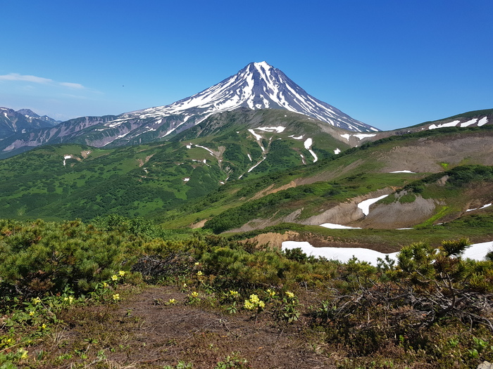 Итак, Камчатка не пустила нас дальше, и оставила детально исследовать Вилючинский перевал. Представьте: все в зелени, буйство красок, множество маленьких цветов, пахучий кедрач. До этого момента, я даже не знала о его существовании. Это такие хвойные кусты, высотой по пояс с мягкими неколючими иголочками. И его много. От этого отчетливо чувствовался его аромат. И цветы, цветы, цветы повсюду. Маленькие, желтенькие, их не зразу и заметишь, если не приглядываться. Тут же и снежные языки, куски ледников, которые таят на солнце, давая начало ручьям, водопадам, и, в конце концов, бурным рекам, по которым рыба идет на нерест. И конечно, Вилючинский вулкан, до которого можно было дотянуться рукой, если смотреть в бинокль. А он у нас был. А еще, вдалеке хорошо просматривался дымок Мутновского вулкана, и правее, тот самый Горелый, куда мы планировали попасть, но уже не в этот раз.
