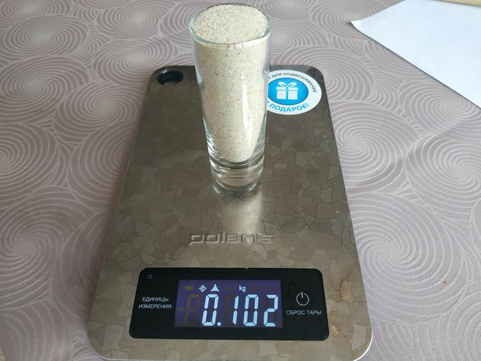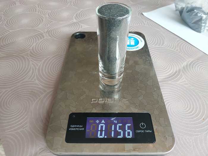 И решил проверить его магнитные свойства. Для начала взвешиваю просто для сравнения с обычным песком, так как он субъективно казался тяжёлым. Разница примерно в 1.5 раза (без тары, конечно):