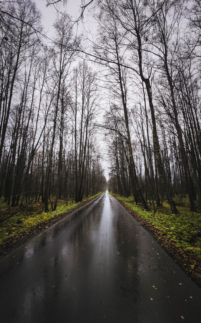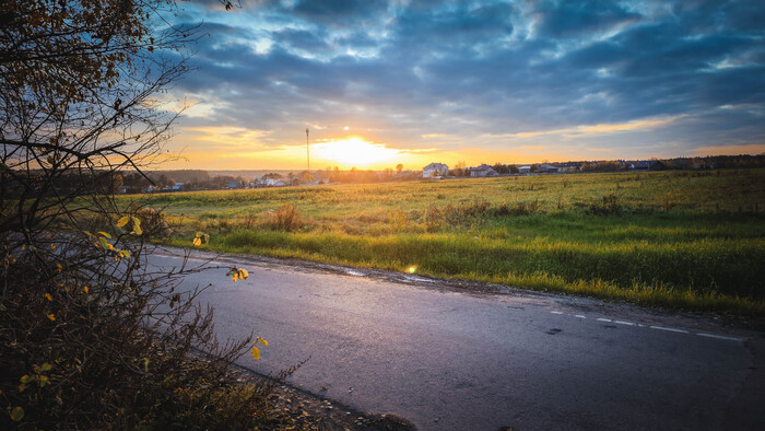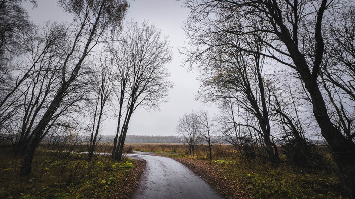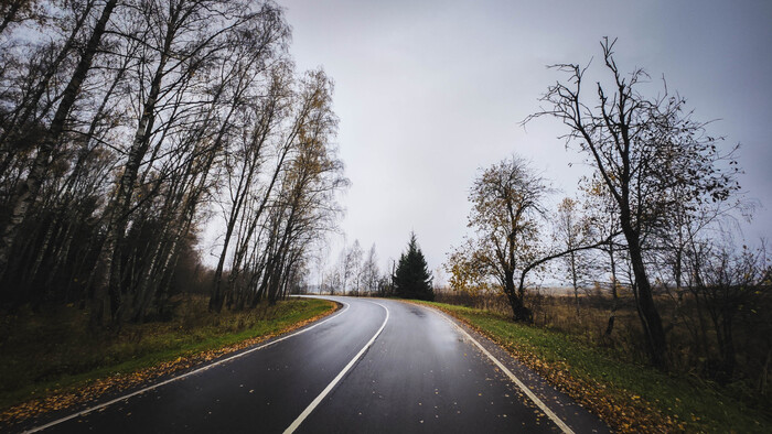 Дождя нет. Но небо затянуто тяжелыми свинцовыми тучами, в воздухе висит водная взвесь, из-за которой не высыхает дорога и все вокруг покрывается водным слоем. Над полями туман и легкая дымка.
