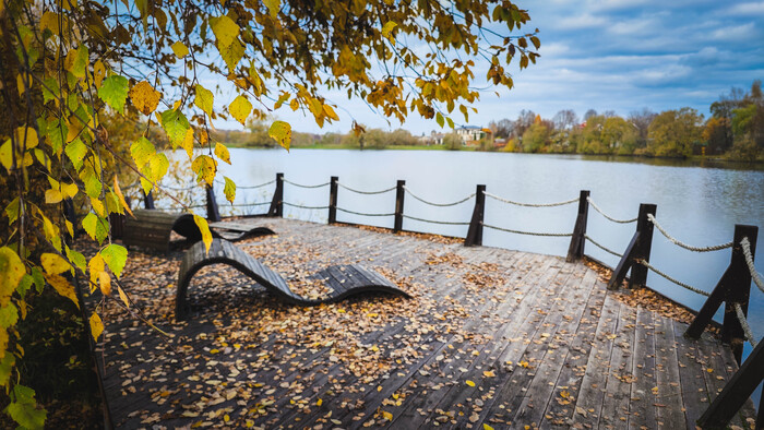 Деревянная набережная, усыпанная листьями, уже старая, местами покосившаяся и оттого куда более антуражная и аутентичная, нежели была бы новой. Да, мне такого больше нравится.