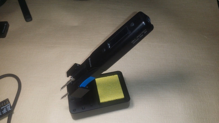 Подставка имеет прорезиненное основание, что исключает скольжение на рабочей поверхности, обеспечивая надёжную фиксацию. В комплекте также предусмотрена губка для очистки жала, что обеспечивает долгий срок службы и высокую точность работы.