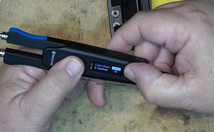 Настройки производятся с помощью удобных кнопок, которые позволяют регулировать температуру от 50°С до 500°С с шагом по умолчанию в 50°С, что идеально для различных типов пайки — от мелких компонентов до более массивных деталей.