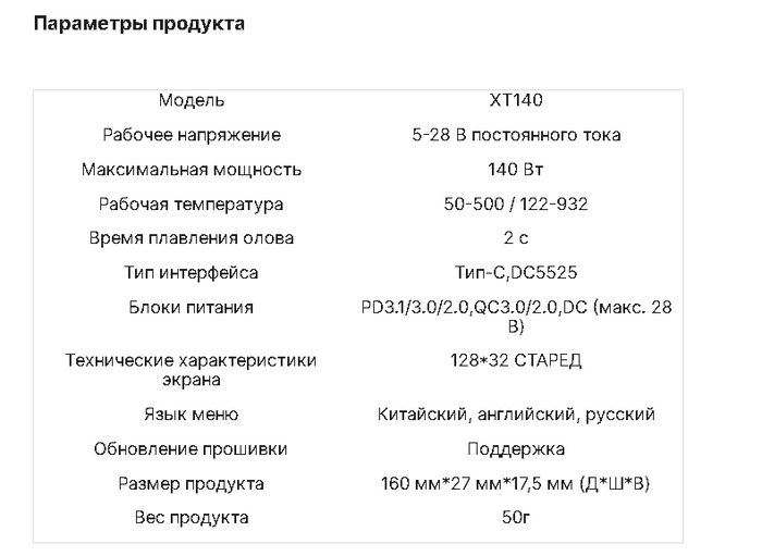 Для работы предусмотрены два варианта подключения: DC5525 и Type-C с поддержкой PD3.0/QC2.0. Максимальная мощность — 100 Вт, а температурный диапазон — от 100 до 450 градусов.