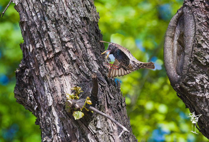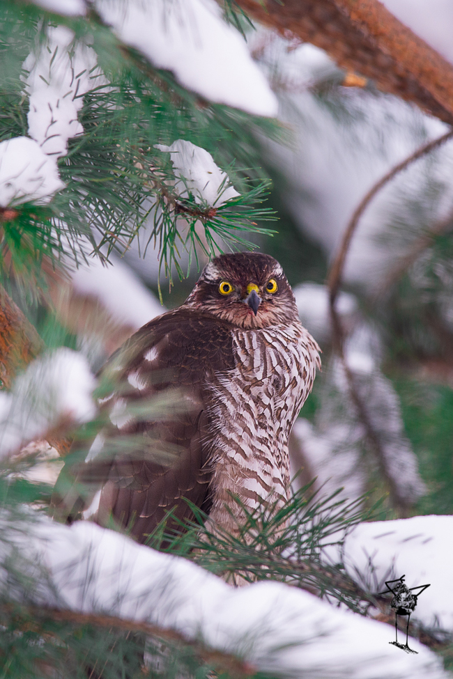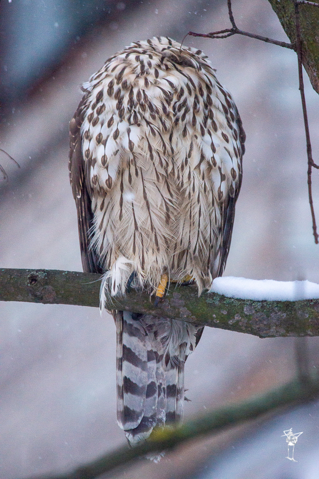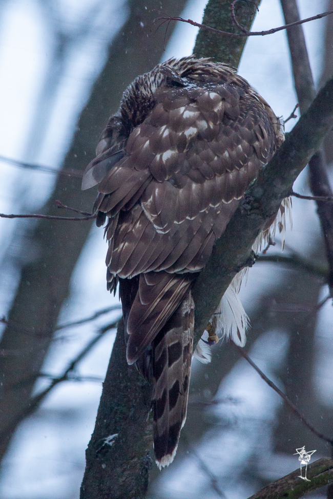 Голова была спрятана под крылом. Птица не среагировала на синицу, которая попыталась полетать рядом с хищником и успокоившись улетела. Когда синица с чириканьем пролетела первый раз, то птица вздохнула сильно поднявшись вверх, моk говоря "как же вы задолбали".