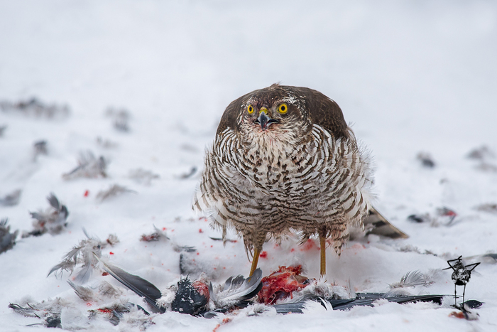 Ястреб-тетеревятник со следами трапезы на перьях под клювом.