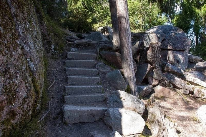 Семь гранитных ступеней приведут вас на небольшую каменную площадку. Именно здесь заканчивается исторический парк – дальше начинается экомаршрут по лесной части острова. По одной из версий эти семь гранитных ступеней символизируют семь смертных грехов. |