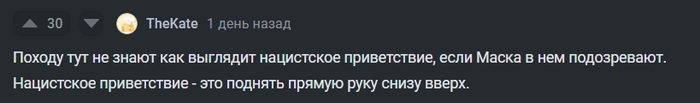 «Патриотический бред»: Маск, якобы, воспроизвел «салют Беллами» — жест, который американские школьники забросили еще до того, как Трамп научился писать свои имя краской для волос. Но, боже правый, Илон-то вырос в ЮАР! Там салютуют не флагу, а белым носорогам и банкам с «Спрайтом».