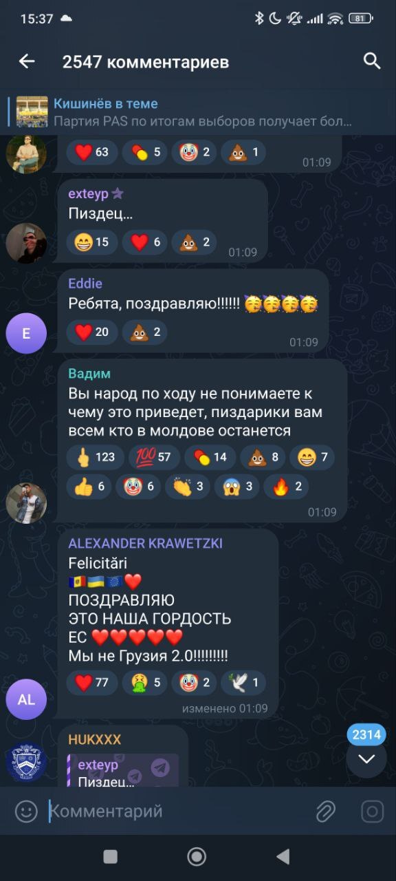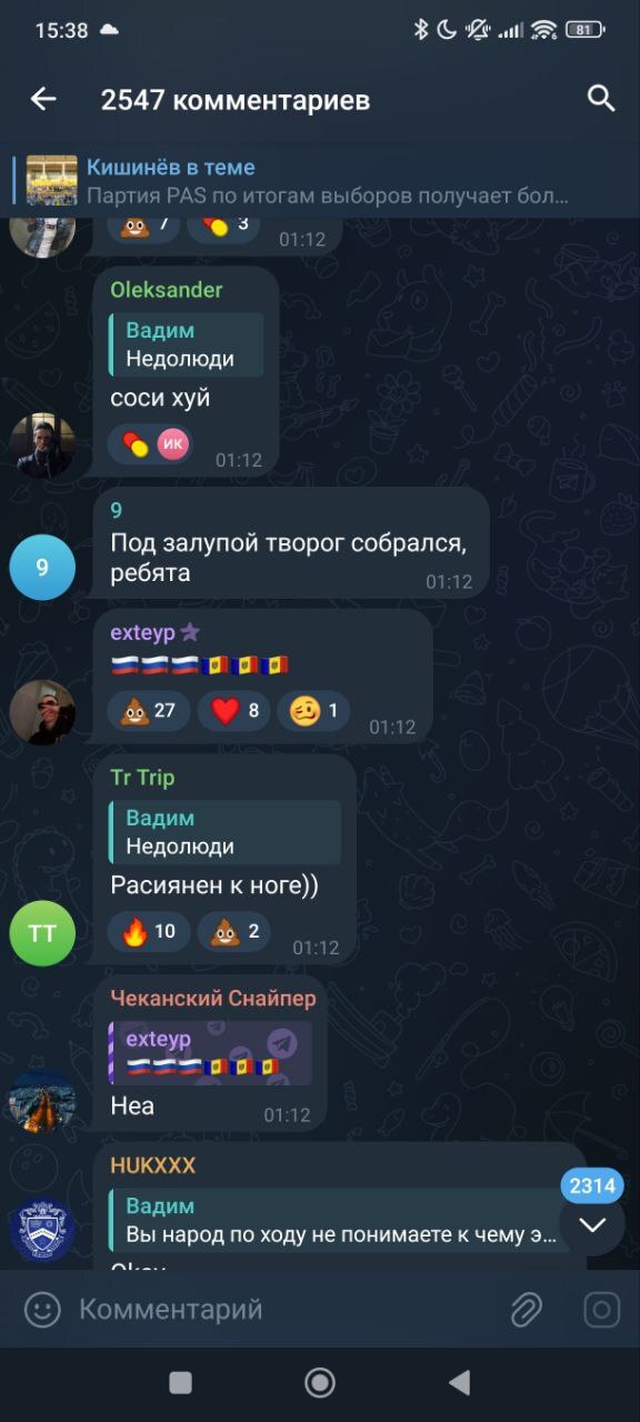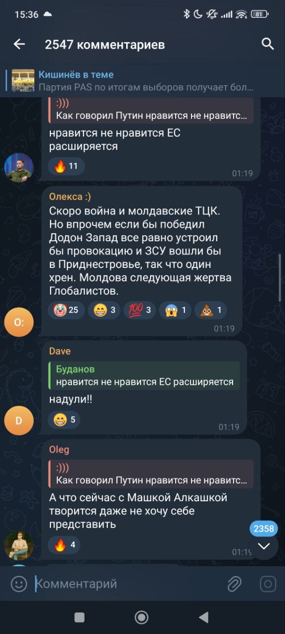 Причем, в телеге есть канал именно нашей страны "Кишинев в теме", думал в коментах увижу что-то разумное, и что по итогу там видно, кучу хохлов и ципсо орущие про то, что мы все ближе к "пахнущей Европе", долой русских орков, а так же все это присыпано ботами, любое другое мнение там не то что порицается, оно закидывается говном, вместе с родней до третьего колена написавшего данное мнение автора. Как забавно как там много однотипных аккаунтов ботов и ципсошников которые выводятся лайками в топ, да там есть реальные комментарии людей голосовавших за другое партии, но их так же мало, как и тех комментариев - реальных людей, которых погружают в нарнию с говном, только потому что человек считает неплохой идеей считаться по должному с ядерной державой, в топе этого мира, которая может разбомбить Молдову за пару минут. Забавное наблюдение, что не обязательно обладать экстраординарными навыками чтобы отличить ботов(даже фотки у некоторых ботов сгенерены ии) и ципсо от реальных обычных людей с их законным мнением, достаточно заглянуть в их аккаунт, у ботов либо там нет инфы, либо вся инфа скрыта, у ципсо бывают фотки, но их так же легко определить по ненависти к России которая выражается в их фото. В то время как у реальных людей видны разные фото, подарки, публикации, и как неожиданно, что обычно этих людей и гнобят в комментариях за неправильное мнение)))