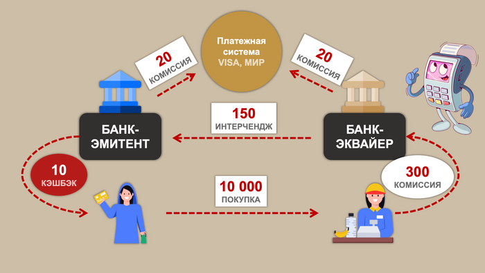 Когда вы оплачиваете покупку по безналу, магазин получает лишь 97% ваших денег, потому что 3% идет банку в качестве комиссии за эквайринг – прием и обслуживание операций по карте. Банк-эквайер делится этой комиссией с платежной системой, а также с банком-эмитентом, который обслуживает счет покупателя. Доля комиссии, которую эквайер переводит эмитенту – интерчейндж, и позволяет банку выплачивать вам кешбэк. Чем выше интерчейндж, тем более приятные бонусы получают клиенты – повышенный кешбэк и другие преимущества программ лояльности
