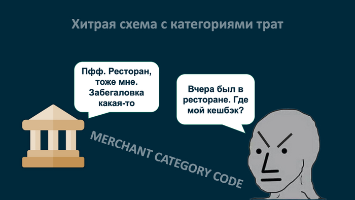 С категориями вообще получается интересная ситуация. Вот выбрали вы в этом месяце категорию кешбэка «рестораны», однако поужинав в одном из них, не получаете возврат денег. Дело в том, что банк-эмитент может отнести эти траты к категории «фаст-фуд» и все, не видать вам кешбэка. Почитайте подробно про MCC-коды. Помимо этого, банки периодически дробят популярные категории. Например, вместо кешбэка на «супермаркеты» добавляют отдельные магазины. Все потому, что экономика программ лояльности не выдерживает такие льготы