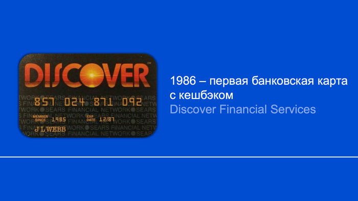 Позже в дело вступили авиакомпании, которые в борьбе за клиента стали начислять «мили» для будущих перелётов. Но настоящий расцвет программ лояльности начался в 1986 году, когда компания Discover (Discover Financial Services) выпустила одноименную карту с возможностью вернуть часть потраченных денег в конце каждого года