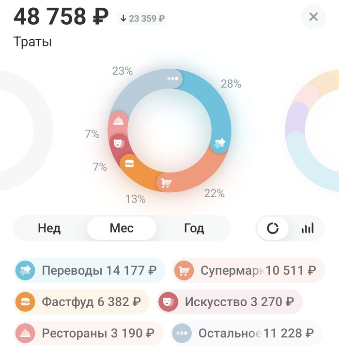 В приложении Т-Банка к тому же есть встроенный инструмент для подобной аналитики: он показывает, сколько денег было потрачено в разных категориях за месяц. С его помощью легко понять, как оптимизировать структуру расходов в паре.
