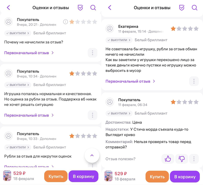 Далее «счастливчики» (покупатели) начинают выкупать этот товар, оставляя тысячи отзывов с оценкой 5/5, думая, что с такой оценкой отзыв точно пройдет модерацию и они получат свои заветные «рубли». Проходят две недели — тишина, проходит месяц — пусто. В итоге «счастливчики» остаются с десятками (в данном случае) игрушек Лабубу и с минус десятками тысяч рублей, а может, и больше.