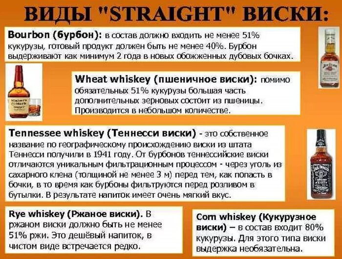 Поговорим о бурбоне. Бурбон — это крепкий алкогольный напиток с крепостью от 37,5 до 67,5°, производимый исключительно в Америке из зернового сырья. По законодательству, бурбон должен содержать минимум 51% кукурузы, а также в различных пропорциях рожь, пшеницу и ячмень. Чем больше кукурузы в составе бурбона, тем слаще и мягче он будет. Если добавляют больше ржи, напиток получается более насыщенным специями, такими как перец и корица, Пшеница придаёт тонкие, слегка фруктовые ноты, а ячмень необходим для запуска процесса ферментации также он добавляет вкус овсяного печенья в бурбон.