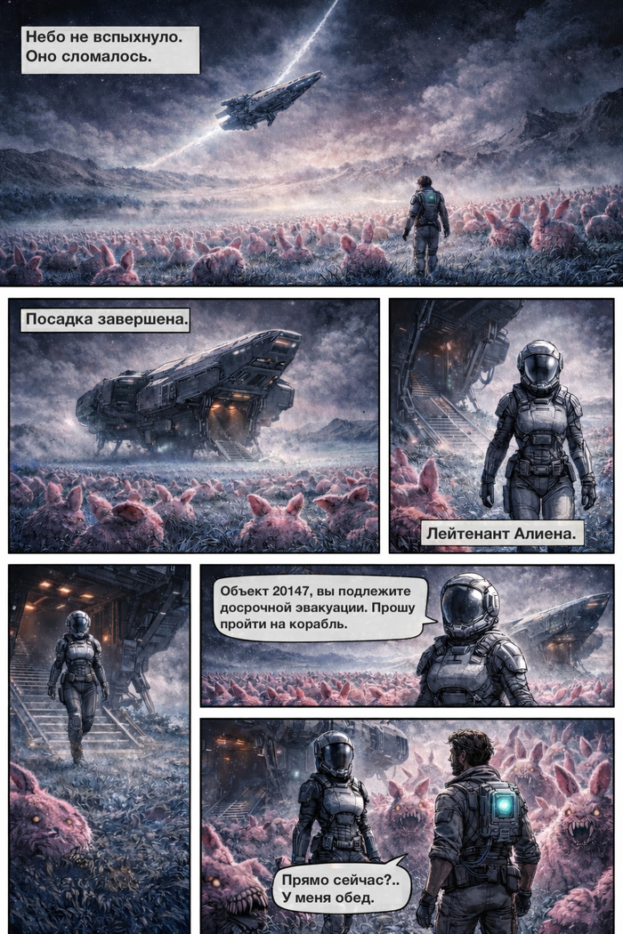Лейтенант наконец отстегнула шлем и сняла его. Под ним оказались взъерошенные волосы и голубые глаза — чистые, как океанская вода. Она не выглядела человеком, привыкшим принимать сложные решения. Алиена растерянно оглядывалась, разглядывая синюю траву и кроликов.