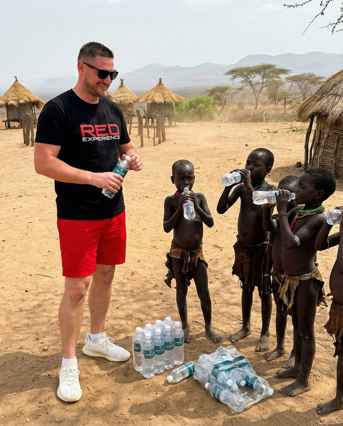 Все началось с фраз: «А слабо тебе привезти в Африку самый бесполезный груз?». Спорили на ящик пива. Варианты были разные: снег в термосе, песок из карьера… Но я решил привезти воду. Целый чемодан🤣, а это 49 килограммов абсурда.