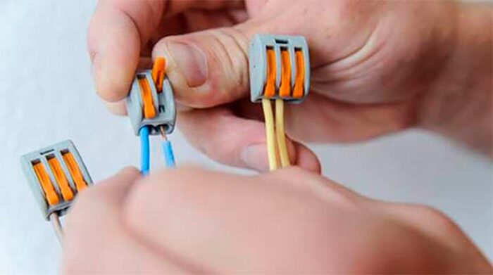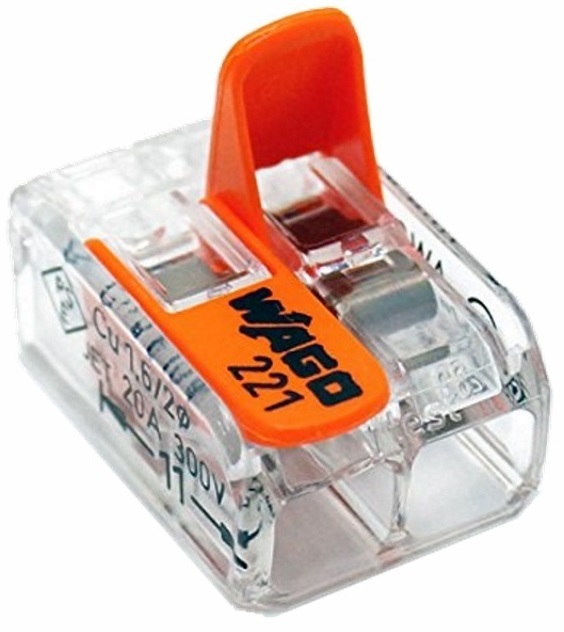Соединение проводов в распределительной коробке можно сделать самозажимными клеммами WAGO (см. фото), в моем примере понадобиться 3 штучки.