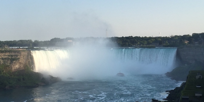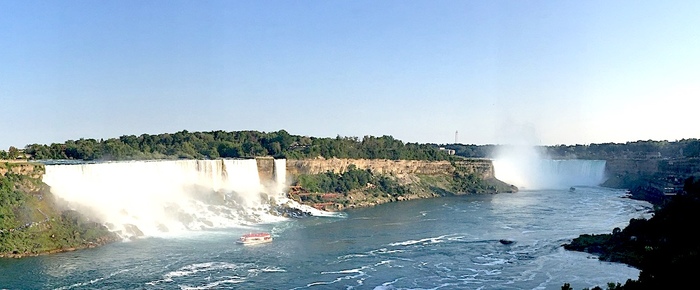 Как я понял, водопадов там условно три, но для непосвящённого взгляда может считываться как два больших: если смотреть с канадского берега, то слева водопад с прямых скал (там рядом находятся Американский Водопад и Водопад Фаты, или Водопад Вуаль Невесты), и справа ещё больший по размеру водопад в форме подковы (который так и именуются, Водопад Подковы).
