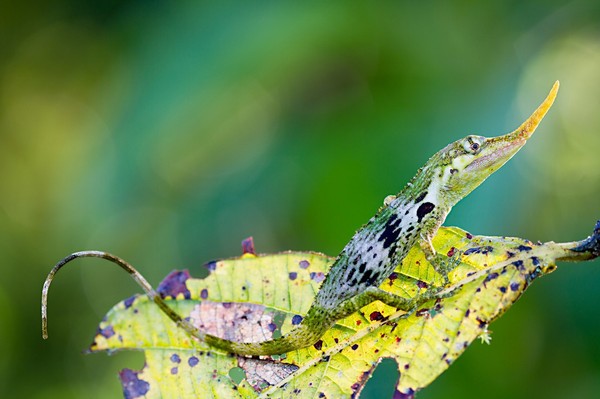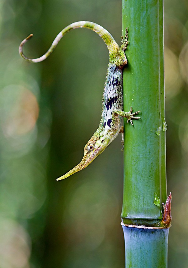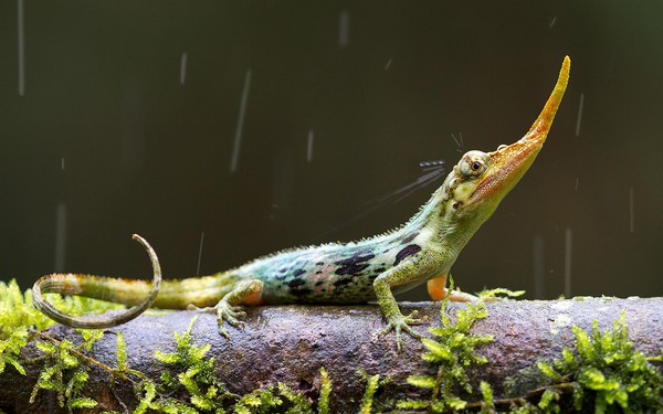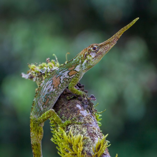 Неофициальное название этого почти мифического существа, обитающего в туманных лесах западных предгорий Анд в Эквадоре, — рогатый анолис. Главное достоинство его элегантной внешности — длинный вырост на голове, похожий на рог носорога. Эту своеобразную шпагу самец использует, чтобы произвести впечатление на приглянувшуюся самку, которую природа обделила таким эффектным украшением.