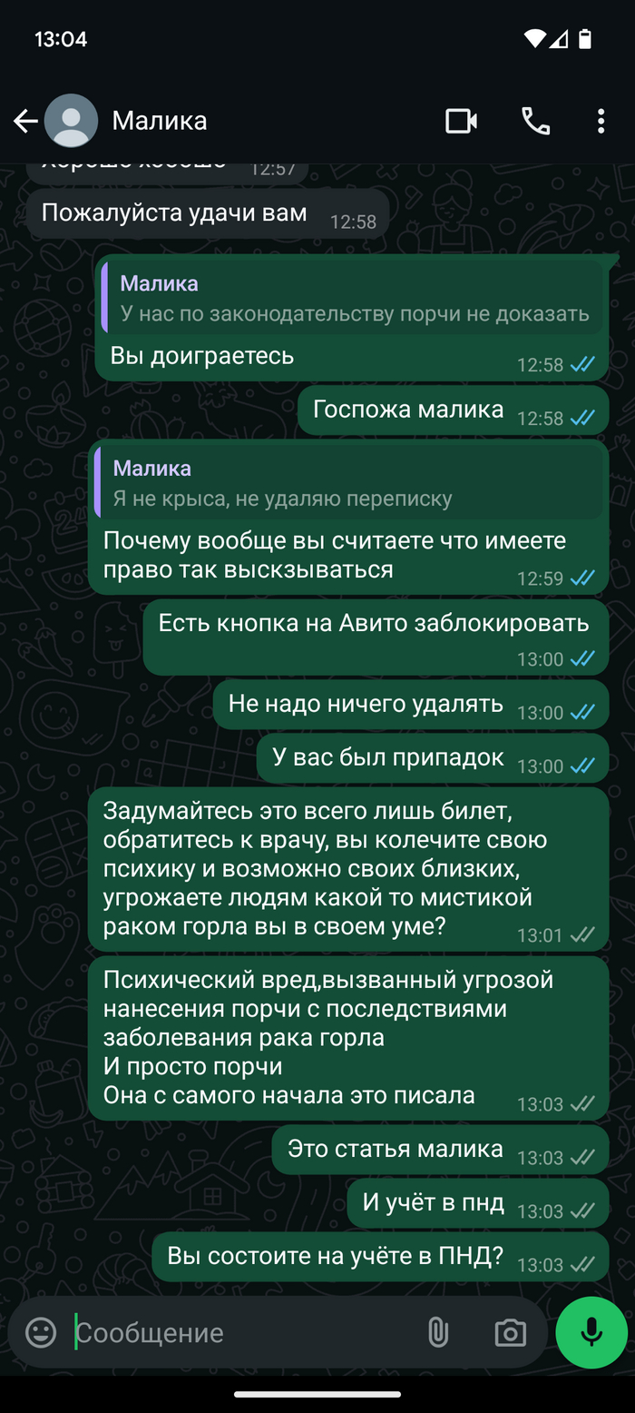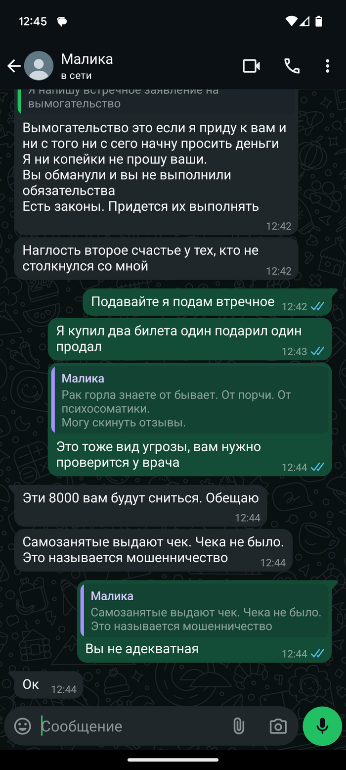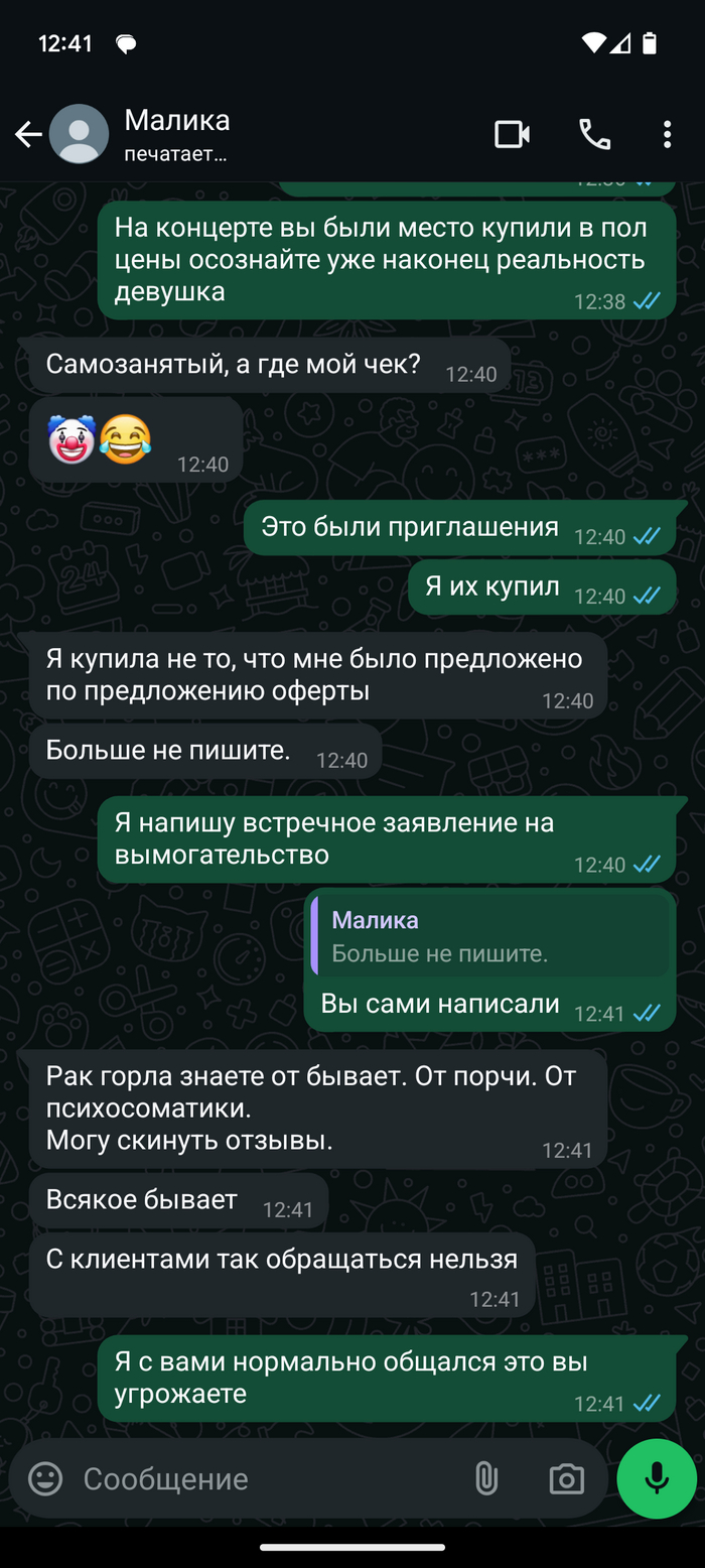 Уважаемые читатели Пикабу! Люди осторожно! Лгунья вымогательница и сумасшедшая! Продал билет на концерт некой Машинке, билет который стоил 15000 рублей за 8000. Скинул ей билет за полтора часа и ждал ее 40 минут после начала, активно занимаюсь уже 8 лет билетами есть множество довольных покупателей. Специально подождал пока она пройдет на концерт и только потом перекинул деньги владельцу с этой сделки я ничего не заработал на второй подаренный билет я посадил маму это был мой подарок на праздник. Девушка видела билет заранее, что там не партер а амфитеатр это было указано в билете, прошла на концерт села и началось! Очевидцы видели как она находилась на концерте в ночном платье и бегала туда-сюда, присылала мне скриншоты о том как она уезжает прямо сейчас, угрожала порчей мне и родственникам все это есть на скриншотах вопила орала в трубку демонстрируя припадок, говорила что едет в полицию на что я предложил ей проехать вместе или увидеться в участке. Начала пробивать мои данные через нет контакт придумывать всякие истории про то как ей дешего предлагали купить билеты, на что не одного подтверждения. Я неделю ее успокаивал пытался предложить разумную компенсацию, но она хотела только всю сумму пугала раком горла... Потом она начала писать с других аккаунтов на мои объявления с других страниц и ставить мне плохие оценки, Авито на это никак не реагировало, вот один случай: концерт начинается седьмого, а она пишет второго числа под другим именем и третьего числа приходит плохой отзыв, хотя в диалоге видно, что мы договорились созвониться за три часа до концерта, то есть она меня обвинила в том что я не ответил ей на ее просьбу за три-четыре дня до оговоренной даты перед началом, Авито не хочет обжаловать отзыв хотя в переписках видно что это полный фарс с целью воспользоваться алгоритмами Авито в свою пользу. На предложения получить разницу в стоимости билета, который она купила повторюсь и так в два раза дешевле. Она требует 8000 и угрожает порчей, полицией и налоговой. Просьба пользователи поднимите пост и Авито представители уделите пожалуйста внимание поведению этой дамы она портит мне репутацию и вымогает из меня деньги за концерт на который сходила, хотя говорила что сразу уехала(на деле вышла и сфотографировала куст у выхода) чтобы получить полную сумму и почему на Авито нельзя обжаловать заказной отзыв который явно полность ю надуманный по датам концерт кстати так ещё и не начался, а на связь мы договорились выйти за три часа до начала, а плохой отзыв что я не вышел на связь уже висит! На вопросы: зачем вы прошли на концерт когда вас не устраивали места она отвечает: 8000 по номеру телефона.