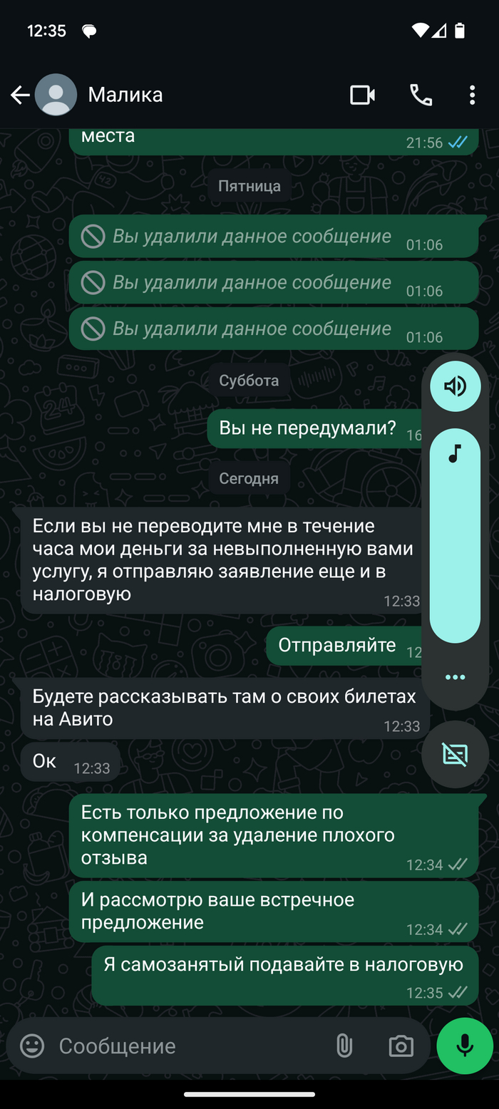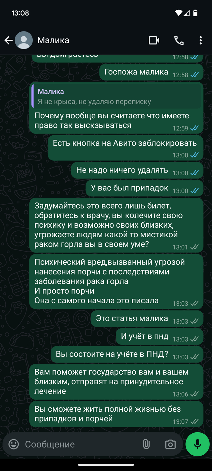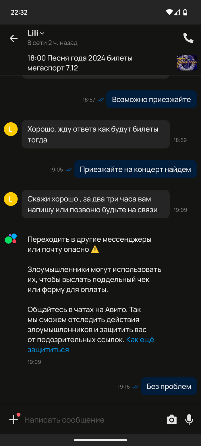 Уважаемые читатели Пикабу! Люди осторожно! Лгунья вымогательница и сумасшедшая! Продал билет на концерт некой Машинке, билет который стоил 15000 рублей за 8000. Скинул ей билет за полтора часа и ждал ее 40 минут после начала, активно занимаюсь уже 8 лет билетами есть множество довольных покупателей. Специально подождал пока она пройдет на концерт и только потом перекинул деньги владельцу с этой сделки я ничего не заработал на второй подаренный билет я посадил маму это был мой подарок на праздник. Девушка видела билет заранее, что там не партер а амфитеатр это было указано в билете, прошла на концерт села и началось! Очевидцы видели как она находилась на концерте в ночном платье и бегала туда-сюда, присылала мне скриншоты о том как она уезжает прямо сейчас, угрожала порчей мне и родственникам все это есть на скриншотах вопила орала в трубку демонстрируя припадок, говорила что едет в полицию на что я предложил ей проехать вместе или увидеться в участке. Начала пробивать мои данные через нет контакт придумывать всякие истории про то как ей дешего предлагали купить билеты, на что не одного подтверждения. Я неделю ее успокаивал пытался предложить разумную компенсацию, но она хотела только всю сумму пугала раком горла... Потом она начала писать с других аккаунтов на мои объявления с других страниц и ставить мне плохие оценки, Авито на это никак не реагировало, вот один случай: концерт начинается седьмого, а она пишет второго числа под другим именем и третьего числа приходит плохой отзыв, хотя в диалоге видно, что мы договорились созвониться за три часа до концерта, то есть она меня обвинила в том что я не ответил ей на ее просьбу за три-четыре дня до оговоренной даты перед началом, Авито не хочет обжаловать отзыв хотя в переписках видно что это полный фарс с целью воспользоваться алгоритмами Авито в свою пользу. На предложения получить разницу в стоимости билета, который она купила повторюсь и так в два раза дешевле. Она требует 8000 и угрожает порчей, полицией и налоговой. Просьба пользователи поднимите пост и Авито представители уделите пожалуйста внимание поведению этой дамы она портит мне репутацию и вымогает из меня деньги за концерт на который сходила, хотя говорила что сразу уехала(на деле вышла и сфотографировала куст у выхода) чтобы получить полную сумму и почему на Авито нельзя обжаловать заказной отзыв который явно полность ю надуманный по датам концерт кстати так ещё и не начался, а на связь мы договорились выйти за три часа до начала, а плохой отзыв что я не вышел на связь уже висит! На вопросы: зачем вы прошли на концерт когда вас не устраивали места она отвечает: 8000 по номеру телефона.