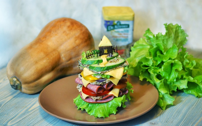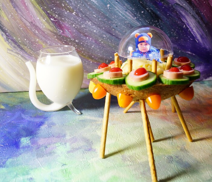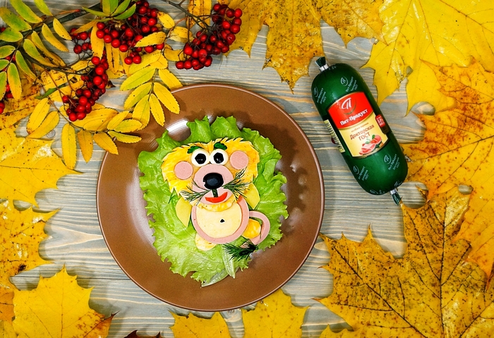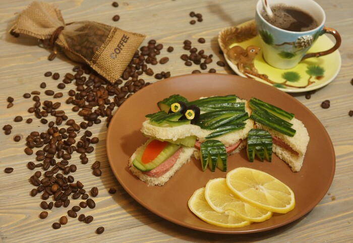 Ну а это вариант детского бутерброда. Тоже какой-то конкурс. Сын был в восторге от его фотки в тарелке. Мама постаралась, мама молодец)