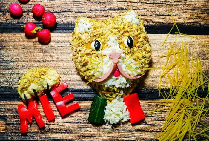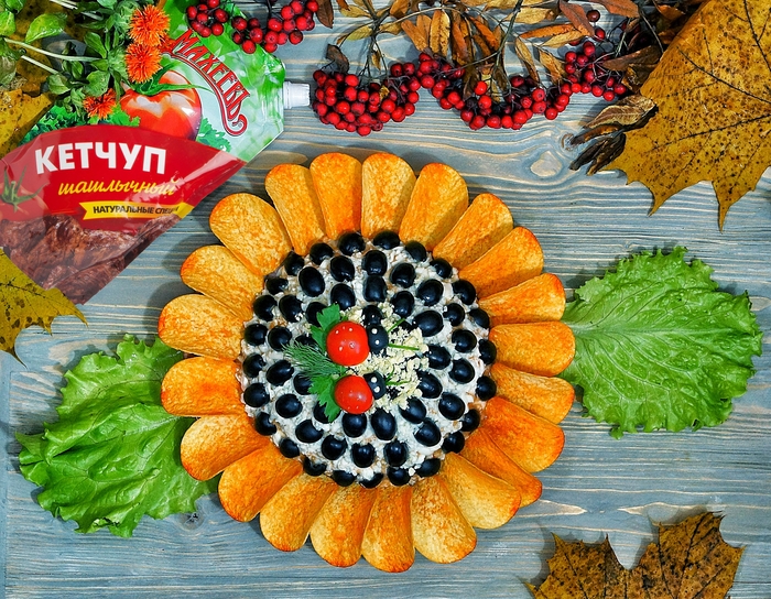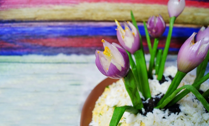 Пыльца сделана из карри. Внутри длинного лука шпажки. Работает с любым салатом. Обещаю , эта подача удивит всех. Проверяла много раз 😃 Проталины сделаны из оливочек натертых.