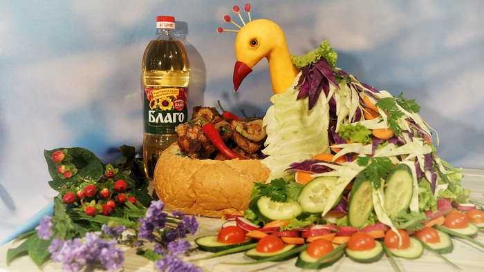 Ооо… А это моя боль. Рана на моей душе! 💔 После этого конкурса, я никогда не покупаю эту марку масла, даже если она дешевле всех остальных. Была задача создать интересную подачу блюда. Блюдом был шашлык. Птица выпиливалась мной из… ТЫКвы!!! А потом ещё полировалась наждачкой🙈 Мои руки до сих пор чувствуют эту тонкую птичью шею, которая ломалась у меня два раза… Этот запах тыквы… о ужас. Мне даже не дали последнее призовое 😃