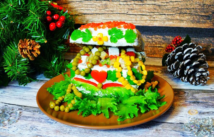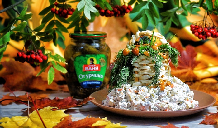 Корзинка плелась из сыра…. Сыра косички 😃 За основу берем сухую соломку. Работает с любым салатом. Внутрь тоже нужно салат положить.