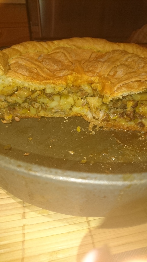 Начинка пропекается великолепно, получается очень сочной и ароматной, картошка сохраняет форму кубиков, но при этом во рту тает как пюре. Никакой сырой картошки или лохмотьев лука типа варёного не будет, если не полениться нарезать их мелко. Лук вообще, такое ощущение, полностью растворяется и уходит в сок. Тесто тонкое и очень пушистое. Это тесто так же подходит и для печёных или жареных пирожков.