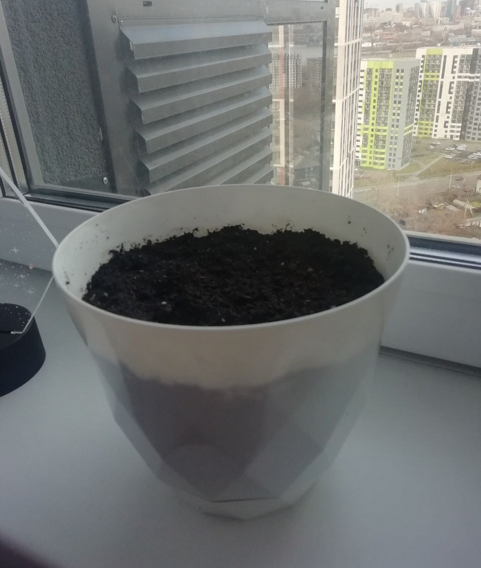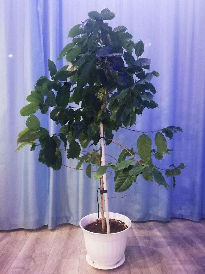 Где-то в районе февраля 2017 г. случайно нашел платок в кармане рюкзака, а там кофейное зерно, про которое я совершенно забыл. Решил посадить, не особо надеясь на что-то. Живу на севере Иркутской области и зерно несколько месяцев в рюкзаке протаскал в лютейшие морозы. Насыпал первой попавшейся земли с дачи для рассады. А оно взошло, месяца через 4-5.