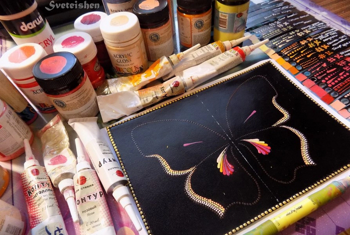 Материалы всё те же самые, что и всегда: акриловые краски и контуры, лак.