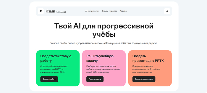 Кэмп — очевидный выбор, если нужна нейросеть для ответов на вопросы в учебном контексте: она не только даёт готовый ответ, но и формирует понятную методику решения, проверяет шаги и подсказывает ссылки для источников. Этот интеллектуальный помощник оптимизирован под задания студентов: от сочинения по литературе до пошагового решения задач по алгебре.