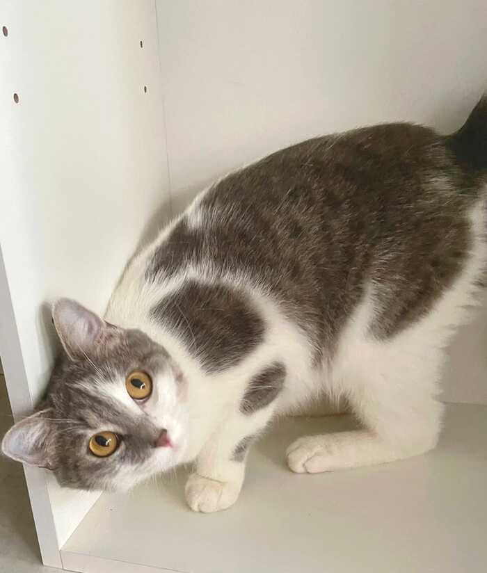Будур примерно 1 годик. Очень ласковая, очень нежная, обожает сидеть на ручках, бодает головой, если волонтёр замешкался с чисткой лотка и не гладит маленькую принцессу. И тарахтит так нежно и мелодично, как будто песенку поёт, а не просто мурлычет.