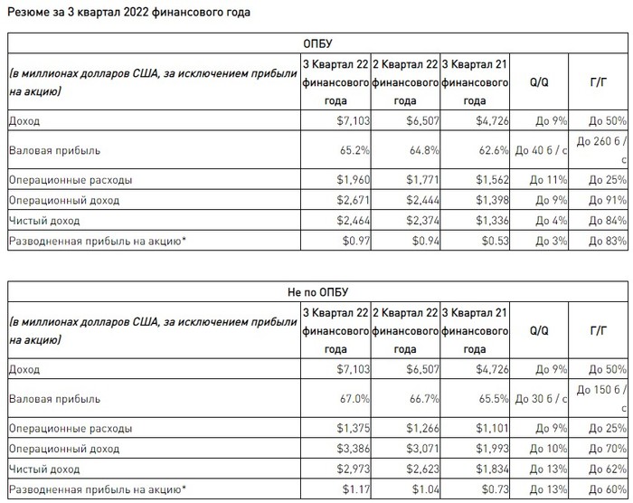 Выручка в третьем квартале составила рекордные $3,22 МЛРД, что на 42 % больше, чем годом ранее, и на 5 % больше, чем в предыдущем квартале.