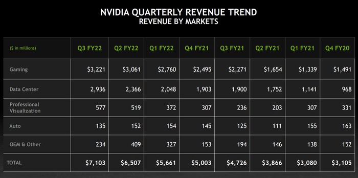 На долю самого прибыльного сектора игровой индустрии компании приходится $3,22 МЛРД выручки за третий квартал 2021 года (2022 фин.года). Это указывает на то, что NVIDIA имеет хорошие возможности для роста даже на рынках с замедляющимися темпами роста, таких как продажи ПК.
