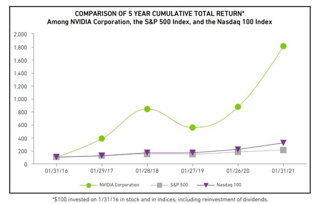 На следующем графике сравнивается совокупная общая доходность акционеров по обыкновенным акциям Nvidia, индексу S&P 500 и индексу Nasdaq 100 за пять лет, закончившихся 31 января 2021 года.