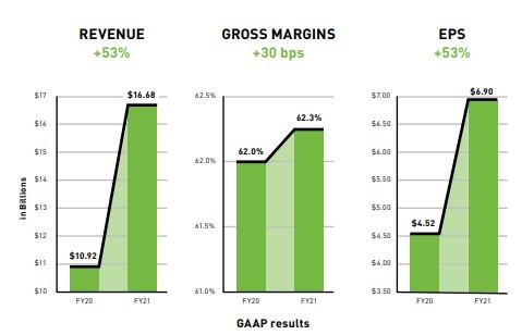 Nvidia достойна звания «лучшая инвестиция года», поскольку цены на акции компании выросли почти на 133% в 2021 году на фоне потрясающего роста его доходов и прибыли.