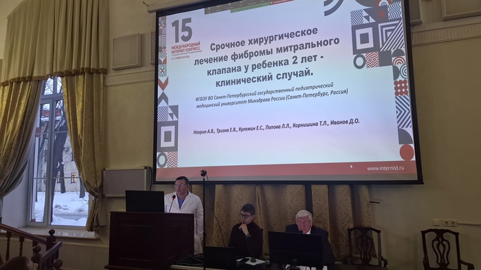 Второй доклад прочитал руководитель кардиохирургической службы СПбГПМУ Андрей Нохрин. Он выполняет весь спектр хирургических вмешательств при врожденных, приобретенных пороках сердца у детей и взрослых. Нохрин описал срочное хирургическое лечение фибромы митрального клапана у ребенка двух лет. Гигантскую опухоль удалили успешно, сохранив функционал митрального клапана.