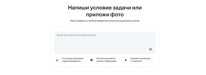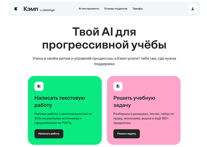 Kampus AI — это образовательная экосистема с множеством инструментов, направленных на помощь учащимся: встроенный ИИ-помощник, библиотека готовых решений, Telegram-бот, функции подготовки к экзаменам и возможность делать работы “под ключ” (например, рефераты, эссе, курсовые). Сервис заявляет, что охватывает более 160 предметов, умеет формировать тексты по ГОСТ-у и предлагает решения задач с подробными объяснениями.