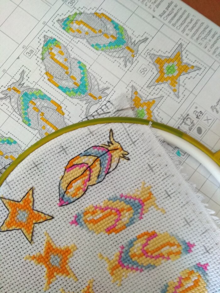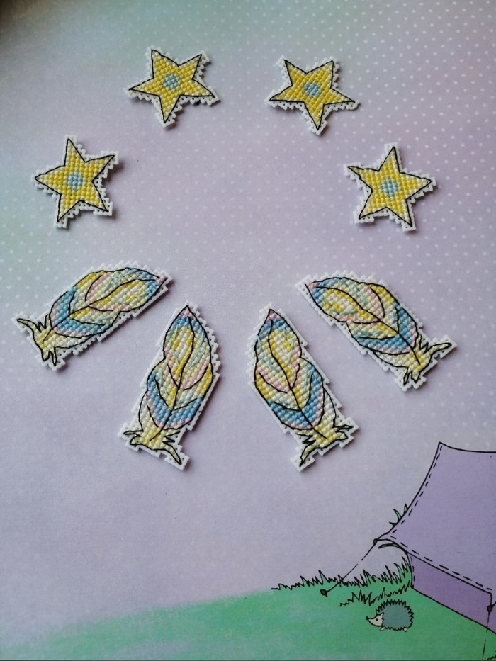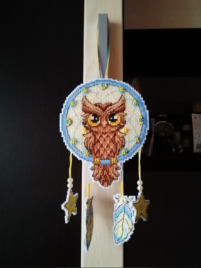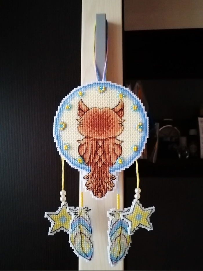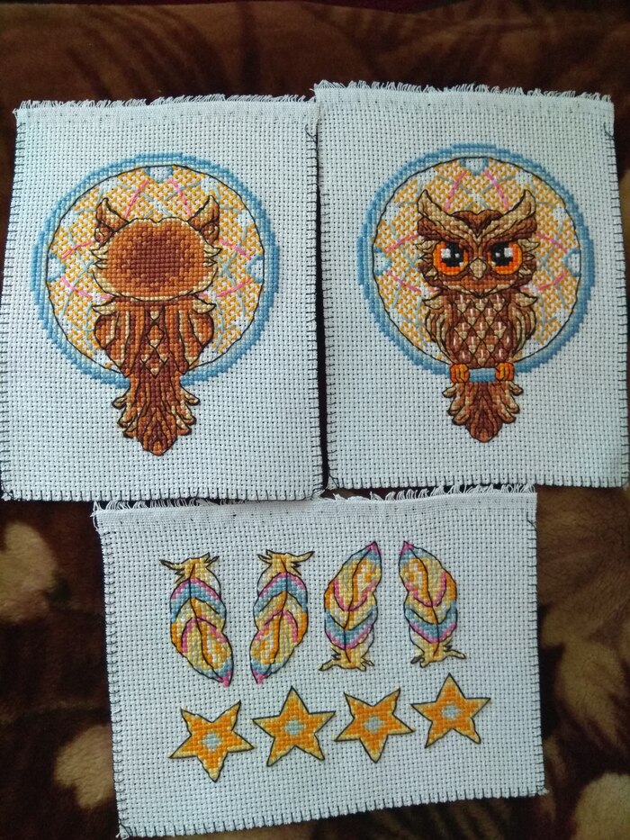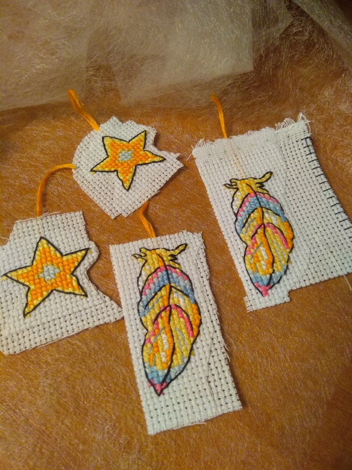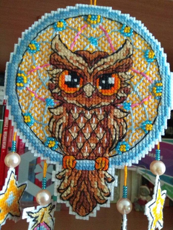 Второй ловец снов обязательно должен был быть с вышивкой. Но оформлять именно картину в ловец мне не хотелось, поэтому я решила вышить перышки на пластиковой канве: