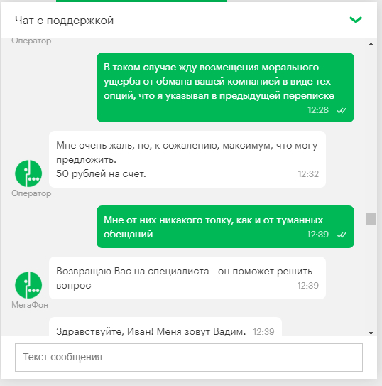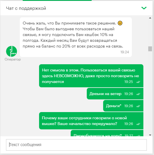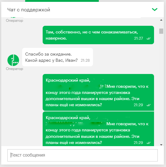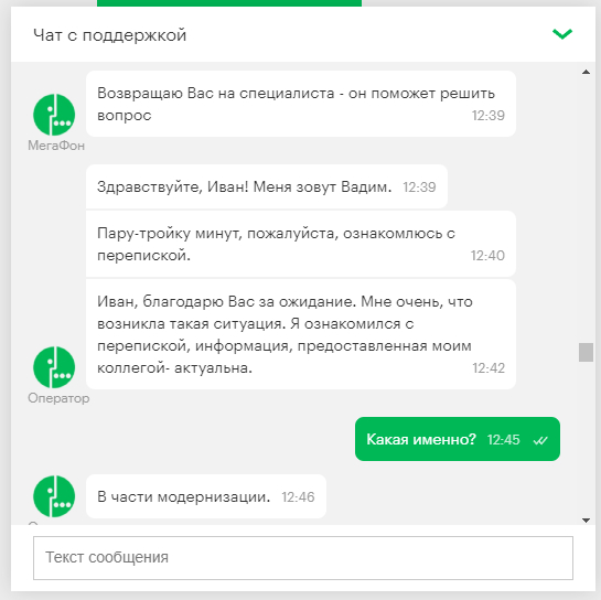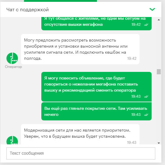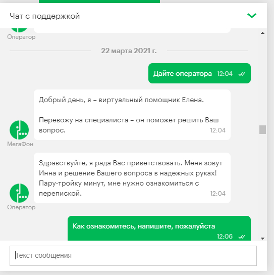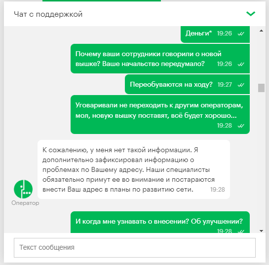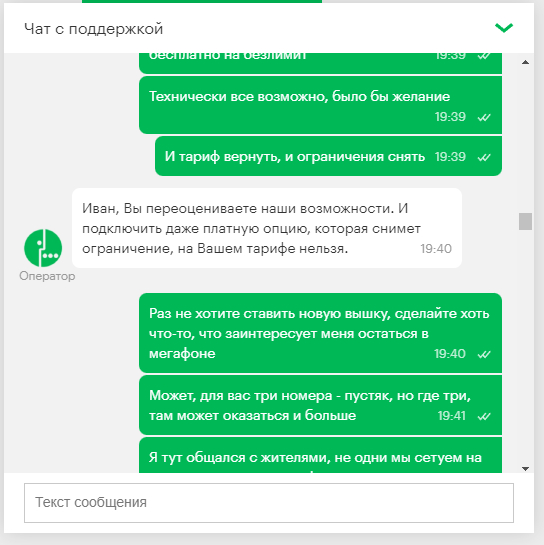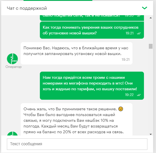 В 2018 мы переехали в новый дом, старшую дочку перевели в местную школу. Туда-сюда, наша школьница по факту без связи, хоть и с телефоном, а тут уже другой дочке надо скоро покупать телефон и симку. Я начал звонить Мегафону и писать в чат в личном кабинете, требуя каких-то мер.