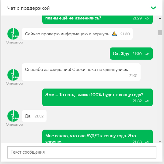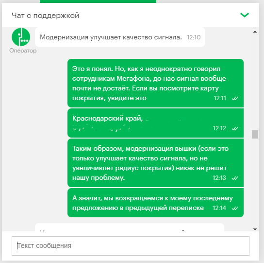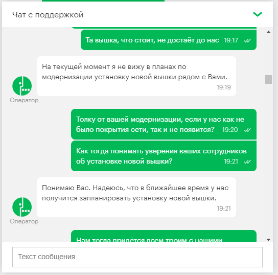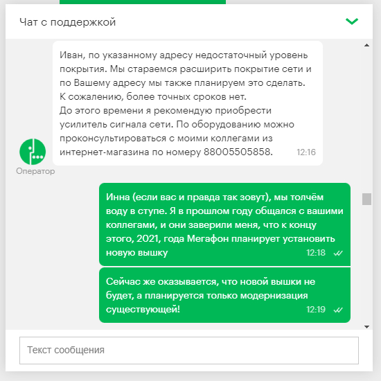 На мой запрос ответили, что поставили заявку на новую вышку. Я приободрился. Как оказалось, зря. Прошло еще полгода, ничего не изменилось.